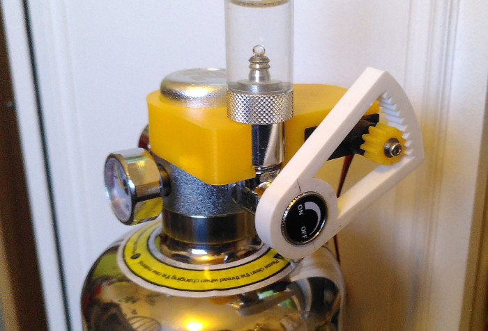 I had a couple of servos kicking around and thought that I could use those to control the flow using the flow valve on the regulator instead. This meant I could adjust the flow digitally rather than trying to judge 'bubbles-per-second'.