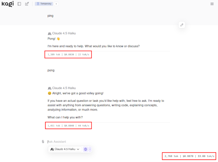I've used Kagi assistant for a while and love it; however, there is one small thing which I found myself missing: the ability to see the total cost of a conversation, and I wasn't alone. I had no sense of how quickly I was using my quota, either. The data is available. Each message in a conversation has an icon which when clicked shows the speed, token count, cost and response time. This is fine, but I want to be able to see the cost of the whole conversation at a glance, not scroll to the end of a message, find the icon and click it.