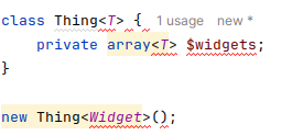 class Thing<T> { private array<T> $widgets; } new Thing<Widget>();
