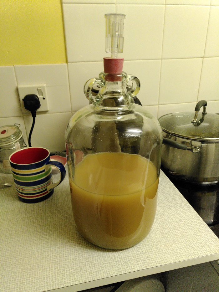 I got about 2.5 L of juice from a 10 L bucket of apples. I put all the juice into a large pot and brought it to the boil. This was a mistake. I only did this because I vaguely remember that was what I did last time. Now that it had been boiled, I needed to add packet yeast and keep everything sterile to make sure that rouge microbes didn't get in and ruin it all.