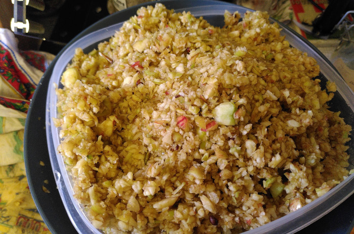 They were given a quick wash to remove the worst of the grime. I didn't have a proper apple scratter, so the food processor stepped up to the job, they were roughly chopped and chucked in, core, stork, seeds, everything. It was a bit slow, but okay for a small batch.