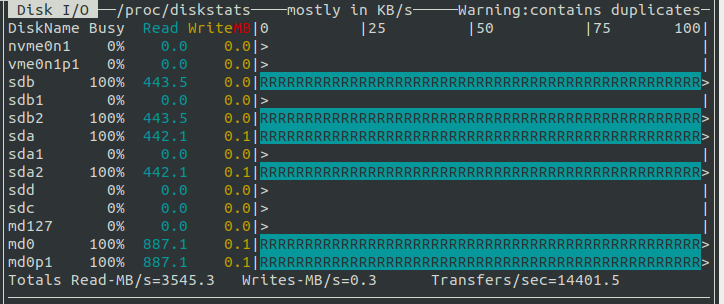 Testing this setup now achieves sequential reads and writes of ~890MB/s and ~130MB/s respectively. The writes are about what you would expect for this drive. The reads, though, are nearly double. This is the benefit of RAID-0, the reads can be parallelised across multiple drives.