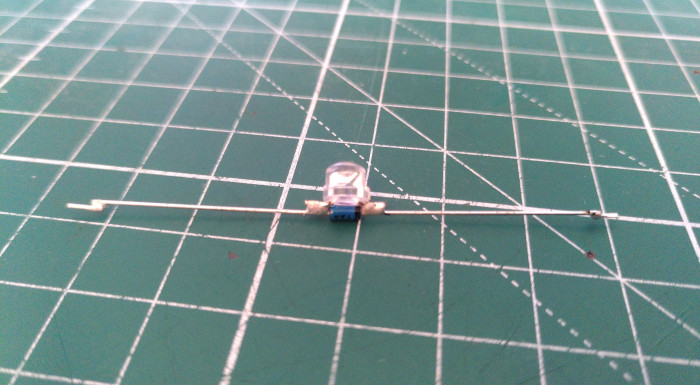 When I read this blog post I had to build one. I already had some red LEDs, but I had to buy the special diodes. When they arrived, I quickly soldered them together, making sure the white band on the diode is opposite the flat on the LED.